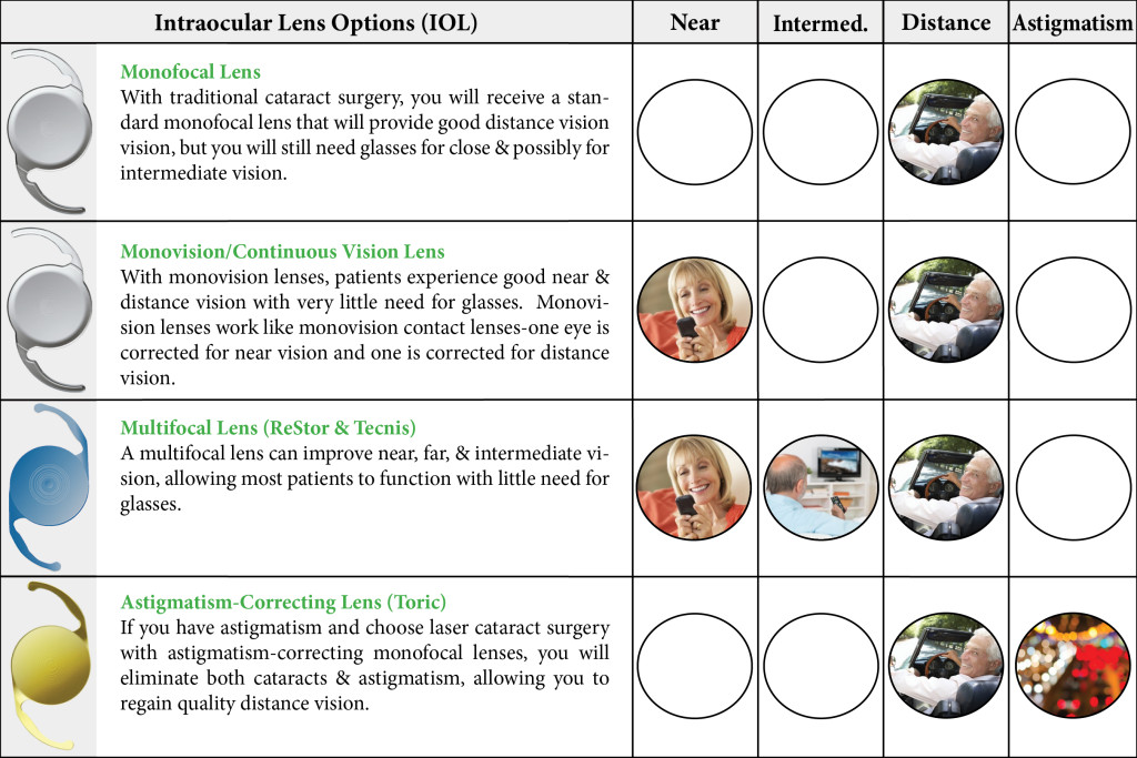 When the cataract is removed, it is replaced with an intraocular lens (IOL). By carefully measuring many parts of the eye before surgery using the latest technology, our cataract specialists carefully select an intraocular lens for each eye. Some patients opt for the latest lens technology called a multifocal or accommodative lens, which may allow for clear vision both at distance and near usually without the need for glasses. For those patients who have had astigmatism, a Toric or astigmatism correcting lens can be used. Others may choose a monofocal lens often allowing for clear vision at distance without glasses. These patients usually require reading glasses. All the most advanced intraocular lens options are available at our clinic. Your cataract specialist will discuss these options with you at the time of your examination.